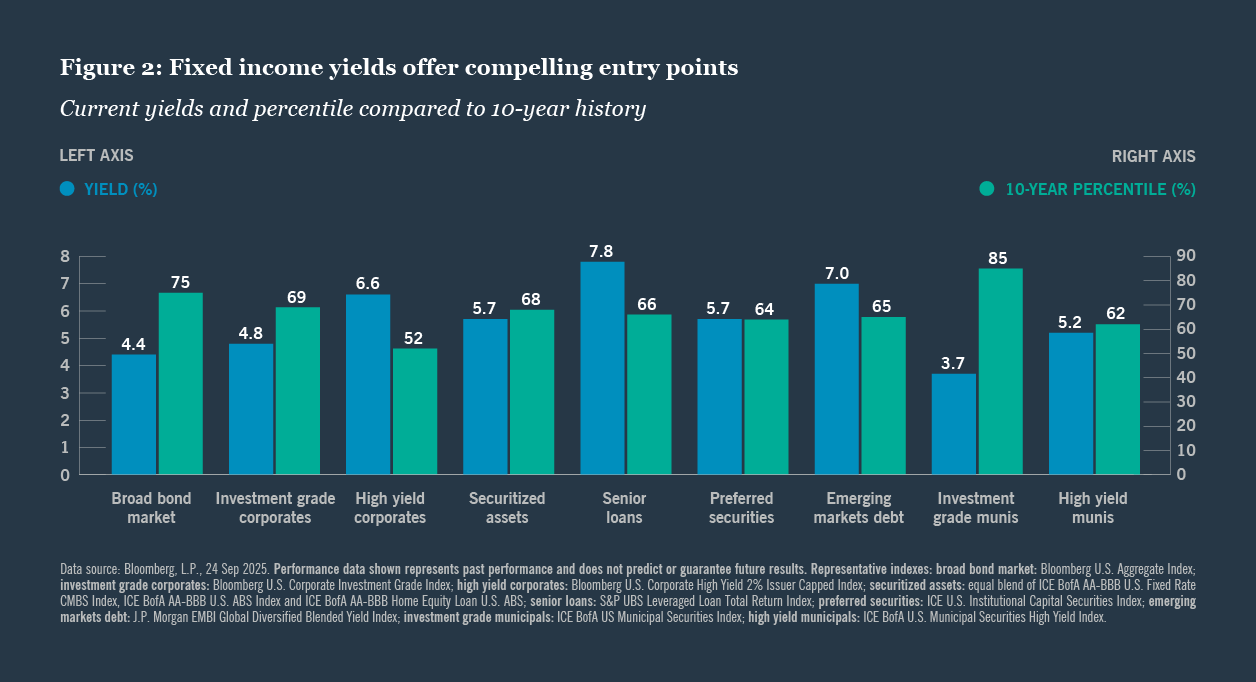 Rather, we think it makes sense to emphasize credit selection and broad fixed income diversification, with a particular emphasis on market segments that continue to offer yields at extremely attractive entry points, on both an absolute basis and relative to their history (Figure 2).