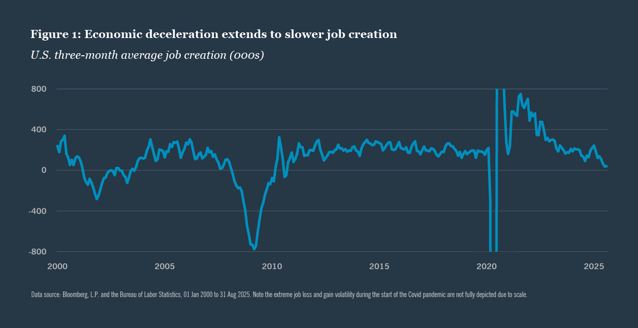 Economic deceleration extends well beyond the headline growth numbers. U.S. job creation has slowed to just 29,000 positions per month (Figure 1), business sentiment surveys have remained weak, and building permits for new housing construction have declined for four consecutive months — the longest such stretch since 2009.