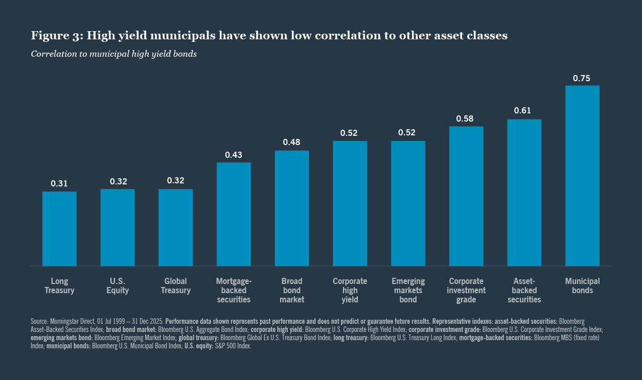 Furthermore, high yield municipals have a low historical correlation to other asset classes, making them an appropriate complement to an overall portfolio. The correlation to equities, Treasuries and corporate high yield is generally near or below 50%.