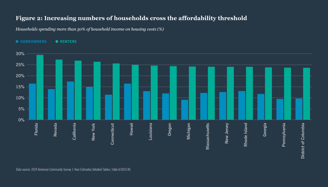 As housing costs have escalated, increasing numbers of American households have crossed this threshold. For example, more than a quarter of renters in states such as California, New York, Florida and Nevada spend over half their income on housing costs (Figure 2).