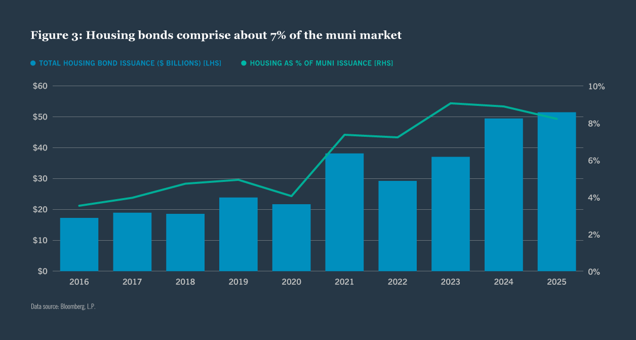 Housing bonds comprise about 7% of the $4.4 trillion municipal bond market and currently yield an average of 3.58% for bonds with 10-year maturities, versus the broader market at 3.06% (Figure 3). Nearly a quarter of all outstanding municipal housing bonds finance projects in California or New York - two states with high housing costs. Annual housing bond issuance has increased steadily over the past decade, up 198% between 2016 and 2025.