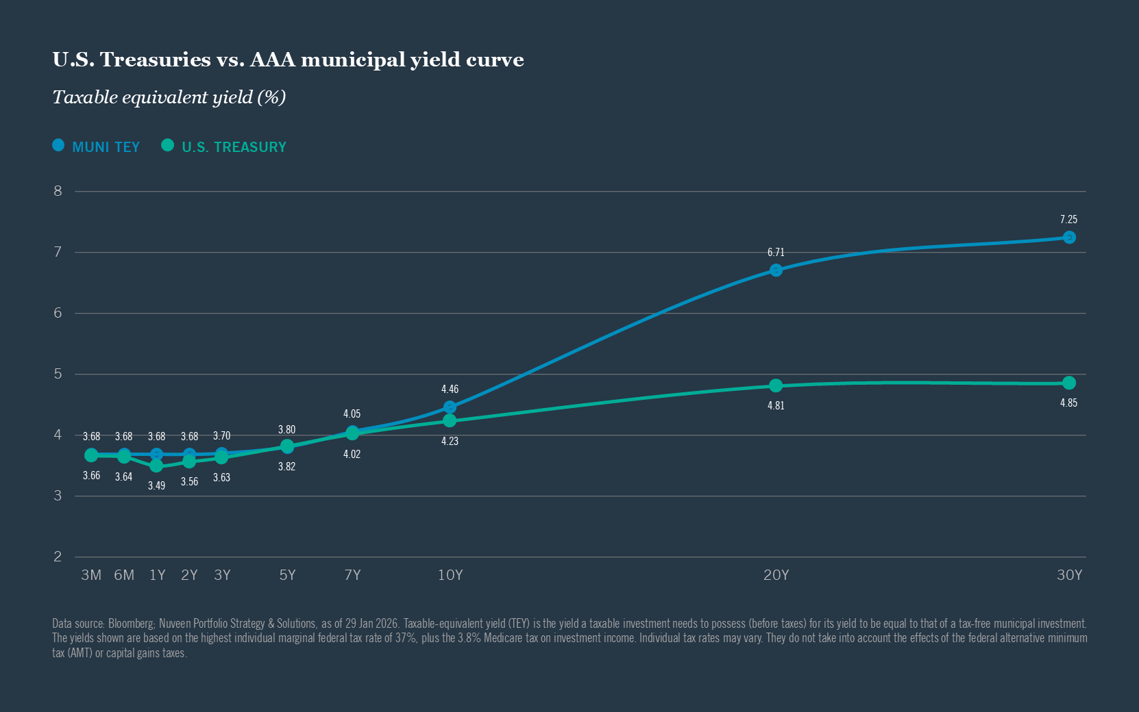 Taxable-equivalent yields are based on the highest individual marginal federal tax rate of 37%, plus the 3.8% Medicare tax on investment income. Individual tax rates may vary.