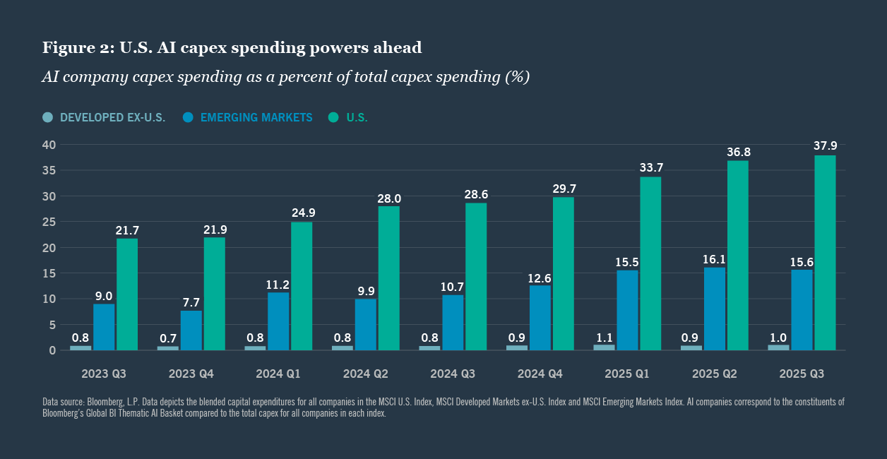 One of the main questions on investors’ minds is whether the AI-driven U.S. equity surge has created a bubble. Additionally, tariffs and the corresponding rise of deglobalization have prompted some investors (particularly those outside the U.S.) to reduce U.S. exposure. But we think U.S. large caps still have room to run. U.S. megacap tech companies may have less-than-clear monetization timelines around some aspects of AI profitability, but we think investors will continue to reward AI-related capex spending, which shows no sign of slowing down in the U.S. (Figure 2).