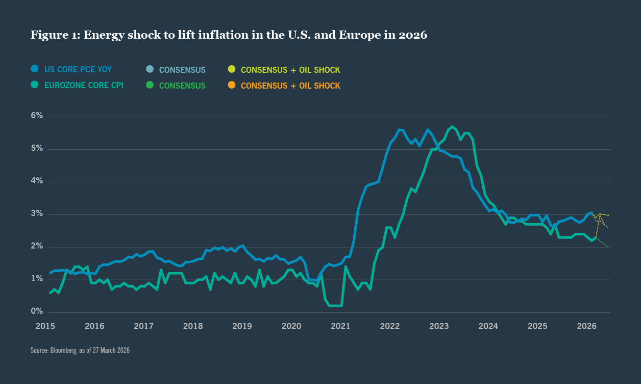 As long as the conflict persists, we expect prices to remain elevated and economic activity to drag lower. Oil prices around $100 per barrel through year-end could boost U.S. headline inflation by about 0.9 percentage points (ppt) and lift core by 0.4ppt, while trimming 2026 U.S. GDP growth to approximately 1.7%. In Europe, energy dynamics could shave around 50 basis points off GDP, compounded by weakening manufacturing activity, deteriorating fiscal positions and negative sentiment. Earlier stimulus tailwinds could help prevent a euro area recession, though downturn risks are rising as supply chain disruptions continue. It is also possible that central banks respond to inflationary signals while underpricing the growth drag.
