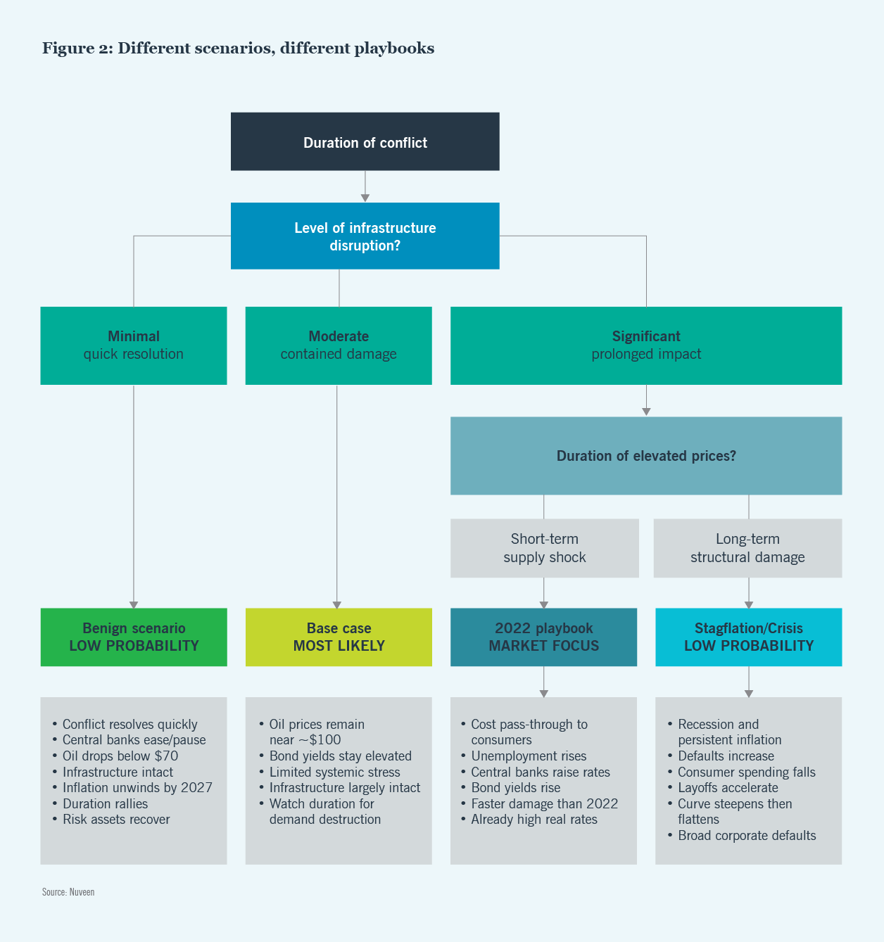 Our base case sits between energy prices remaining elevated at current levels and a de-escalation by end-April, with moderate energy infrastructure damage. But the portfolio response should be sized for a wider range of outcomes, particularly when history cautions that traditional 60/40 equity and bond diversification fails in a supply-driven inflation shock, as experienced in 2022. Figure 2 describes the range of scenarios that investors could face.