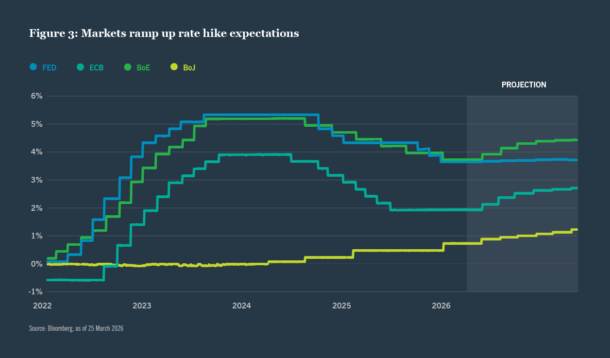 The Bank of Japan (BoJ) was among the least hawkish in response to the shock, recognizing that it weighs on the country’s growth relatively more than it boosts inflation, leaving our two rate hike 2026 view intact. Elsewhere, aggressive rate hike pricing for 2026 appears premature across several G10 economies, including Canada, New Zealand and Australia.