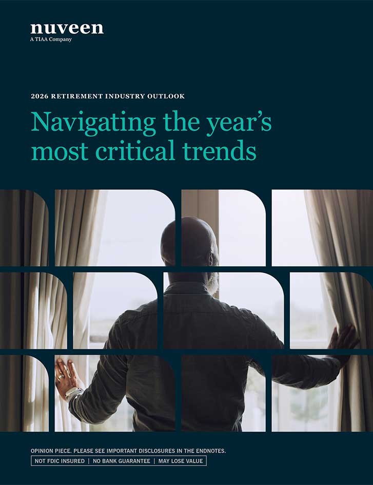 Any guarantees are backed by the claims-paying ability of the issuing company. Before investing, carefully consider fund investment objectives, risks, charges and expenses. For this and other information that should be read carefully, please request a prospectus or summary prospectus from your financial professional or Nuveen at 800.257.8787 or visit nuveen.com. This material is not intended to be a recommendation or investment advice, does not constitute a solicitation to buy, sell or hold a security or investment strategy and is not provided in a fiduciary capacity. The information provided does not take into account the specific objectives or circumstances of any particular investor, or suggest any specific course of action. Investment decisions should be made based on an investor’s objectives and circumstances and in consultation with their financial advisors. Financial professionals should independently evaluate the risks associated with products or services and exercise independent judgment with respect to their clients.
