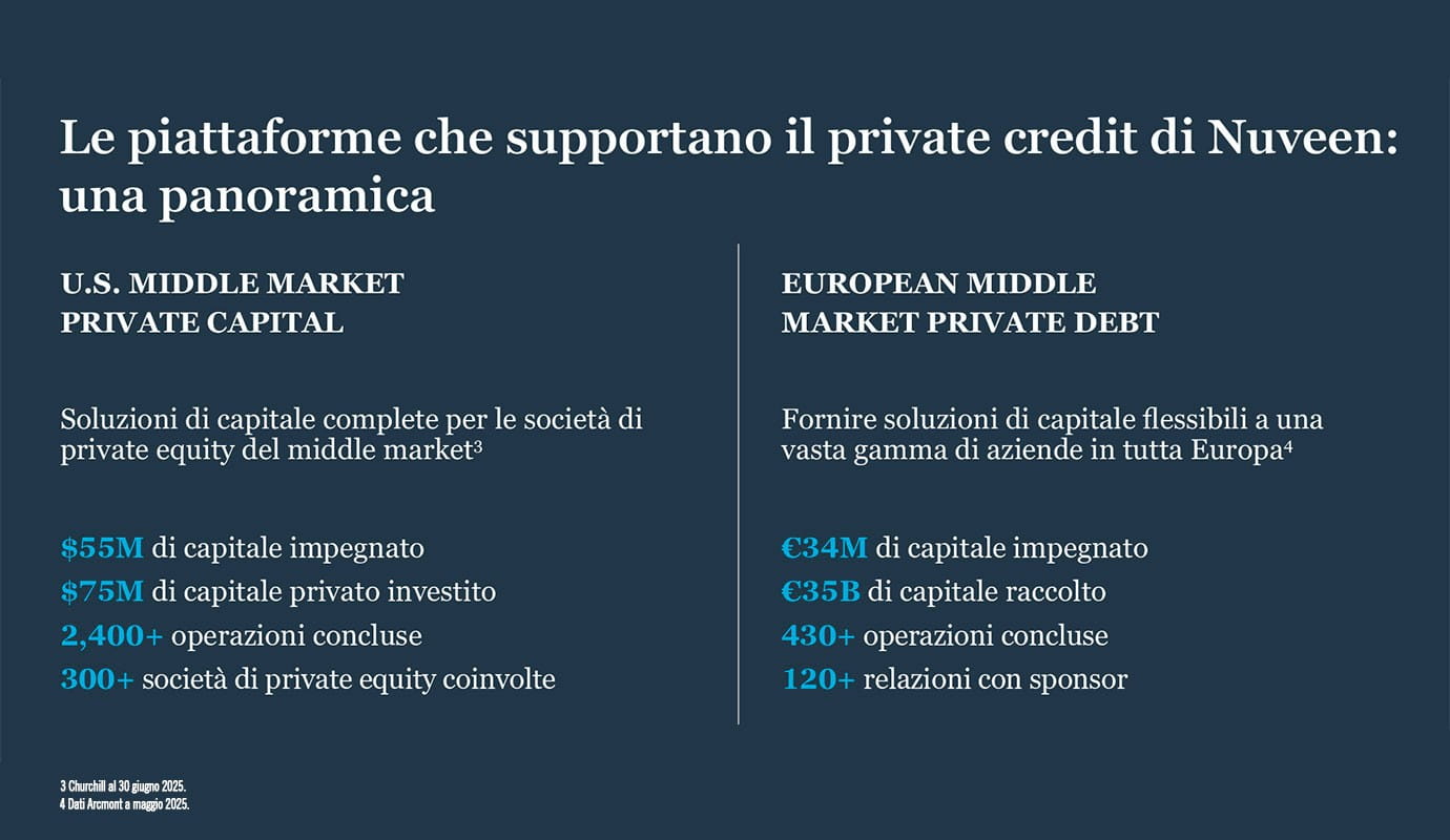 Nel private credit, Nuveen unisce due delle piattaforme con maggior esperienza e relazioni consolidate a livello globale. Entrambe le piattaforme condividono le qualità che contano di più nell’attuale contesto: dimensione, accesso a deal flow proprietario, strutturazione disciplinata e gestione attiva del portafoglio.